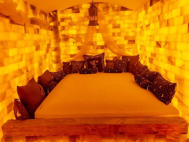 Weiter zur Entspannung in unserer großen Erholungsgrotte mit dem 8% Solesalznebel liegend in den wohl temperierten Wasserbett aus 1001 Nacht