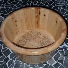 Beginnend mit einem 5“ tigen Sole Fußbad in den Holz-Druckpunkttöpfen gefüllt mit angereicherten Salzwasser