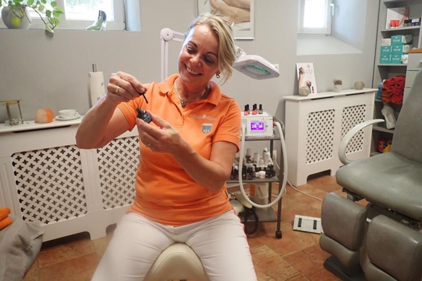 Wir bieten eine professionelle in zwei Räumen die Fußpflege mit den verschiedenen Leitungen an. Unsere Behandlungszeit beläuft sich auf ca.45“-55“ Wir machen die verschiedensten Lacktechniken sowie das Entfernen von Hühneraugen oder auch Spangen setzen.